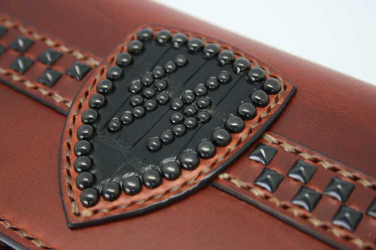 盾、ベルトデザイン部分にスタッズワークが施され、リアルクロコダイルがインレイされる等、個性的な姿に仕上がっております。